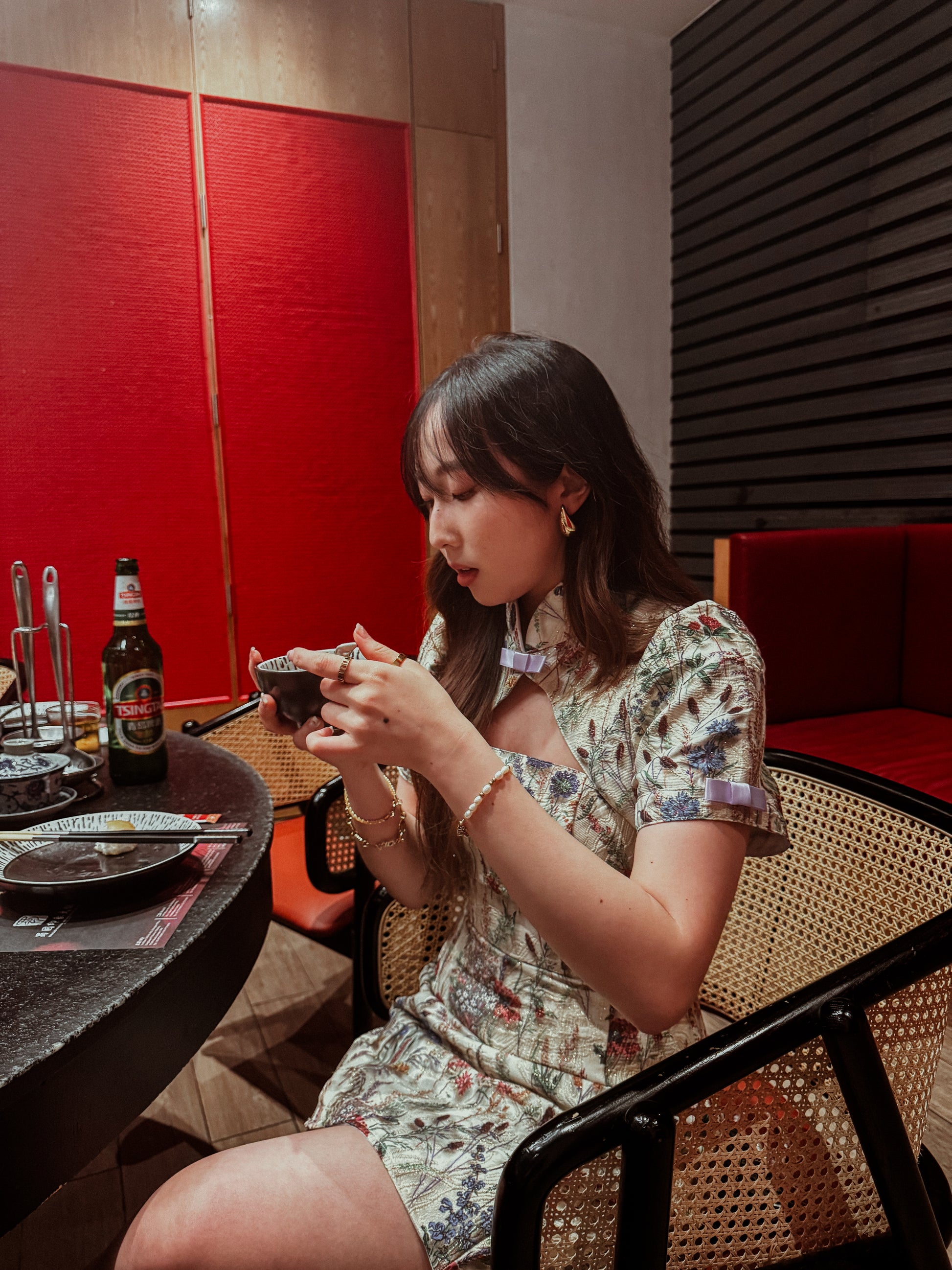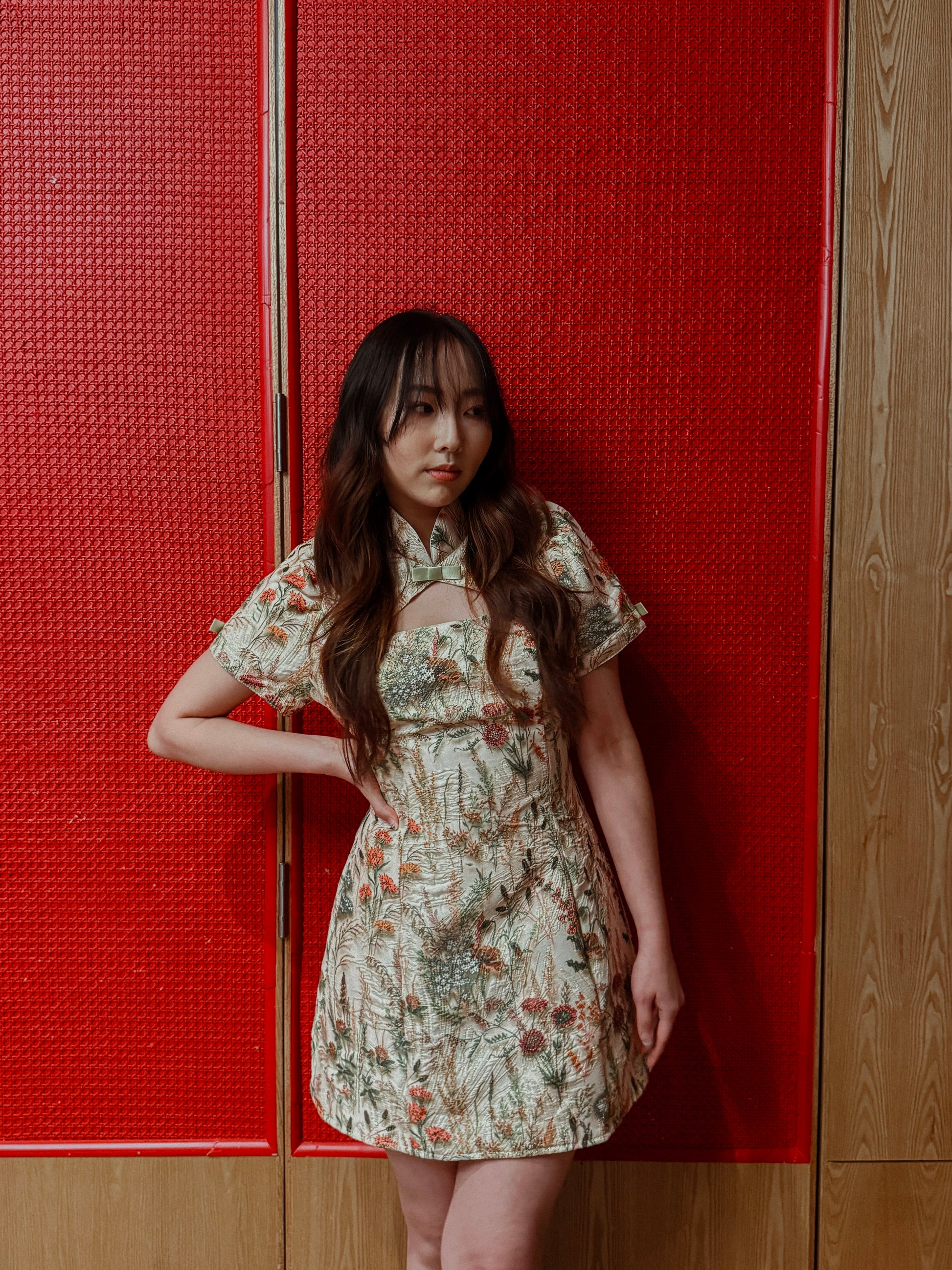 A dramatic yet wearable dress featuring voluminous puff sleeves and a bust cutout. A balance between regal and bold.